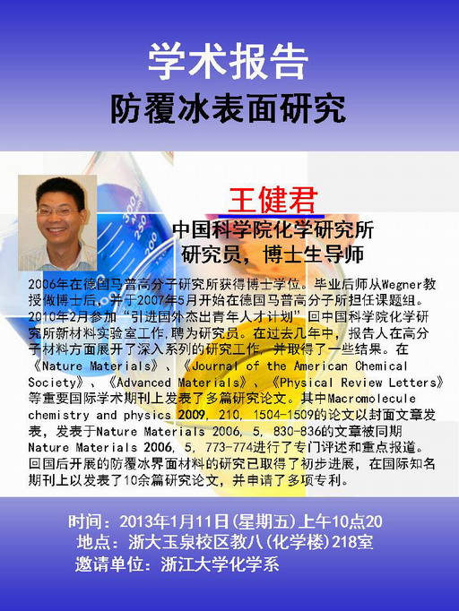 报告主要内容:结冰现象普遍存在并给我们的生活与生产带来极大的不便:降低设备的运行效率,造成不必要的能源浪费,导致安全隐患甚至灾难性事故等等。将冷凝水在结冰之前自驱动移离冷表面无疑是一种理想的防覆冰手段。为实现这个目的,必须考虑两个方面:1)材料表面对过冷水成核变冰的影响;2)冷凝水滴在材料表面的黏附力与冷凝水滴移离冷表面的动态行为的相互关系。本报告将针对这两个问题,报道课题组在防覆冰表面研究工作的新进展。报告将建立材料表面的化学性质与过冷水滴成核变冰的动力学和热力学的相互关系。同时本报告将系统报道材料表面的纳米结构和化学性质与冷凝水滴自驱动跳离表面的效率的相互关系。