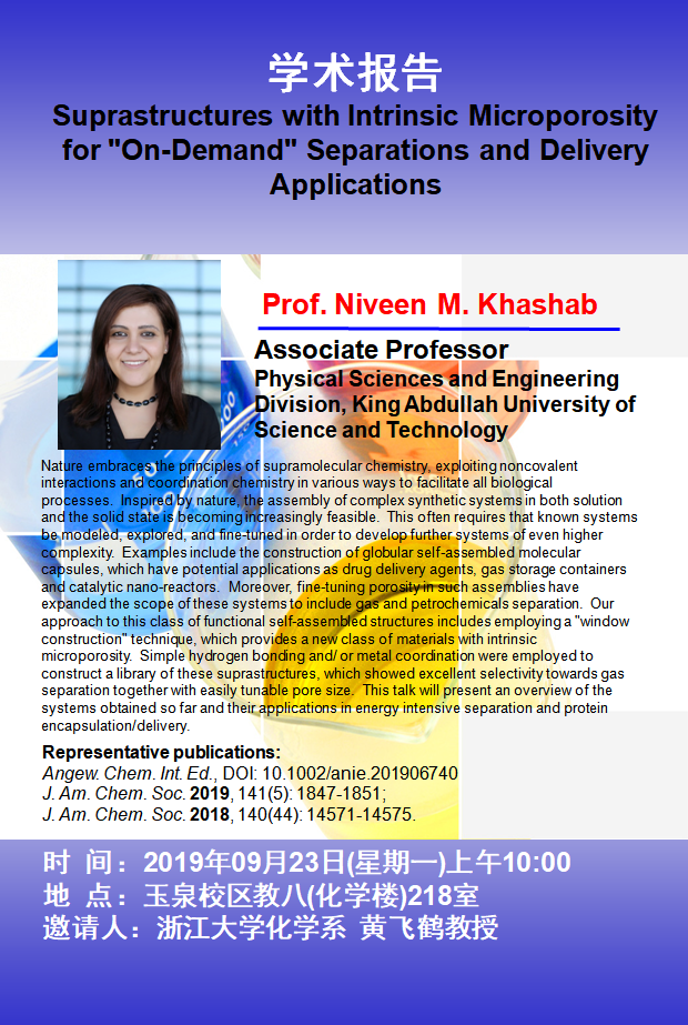 学术交流 当前位置: 首页 > 学术交流 Niveen Kashab(King Abdullah University of Science and Technology) 来源:浙江大学化学系 发布时间:2019-09-06 643