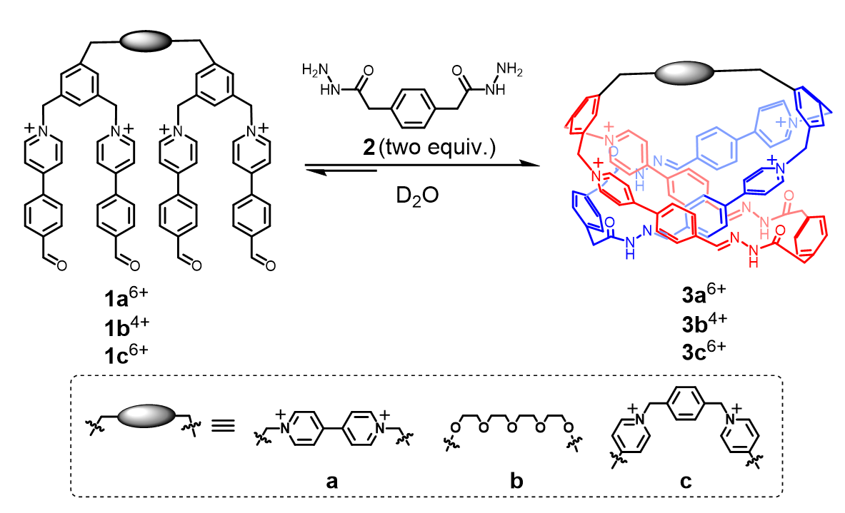本团队通过四苄基溴衍生物与4-(4-甲酰基苯基)吡啶之间的SN2反应,合成了一系列结构相似的四甲酰基前体1a6+·6Br⁻、1b4+·4Br⁻和1c6+·6Br⁻(图2)。其中,1b4+中桥连单元为柔性的四乙二醇链,而1a6+和1c6+中的桥连单元则更刚性。将三种四醛前驱体分别与双酰肼化合物2在水溶液中自组装,最终高效地生成了相应的[1]索烃3a6+, 3b4+和3c6+。研究表明,得益于由强大疏水效应驱动的索烃作用机制,其作为关环反应成功克服了传统大环化过程中的熵不利,进而实现了高达91%的产率。