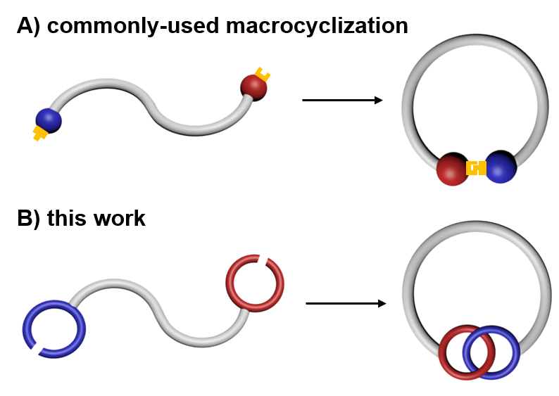 在化学成环反应中,五元环和六元环通常因动力学或热力学上的优势较易形成。然而,随着环原子数的增加,成环过程所伴随的熵损失逐渐显著,导致环化效率降低——例如冠醚的合成常需借助模板效应并在高度稀释条件下进行。当环尺寸进一步增大(如超过100个非氢原子),环化过程的熵罚将急剧增加致使产率骤降(图1A)。此时,即便采用模板诱导策略也难以实现大环的高效构建。李昊教授团队在前期研究中发现,在疏水效应驱动下,两个中等尺寸的环状分子倾向互锁形成索烃(Chem. Commun. 2019, 59, 13108–13111.),此过程通过释放高能水分子产生显著的熵增益,进而实现索烃的高效甚至定量制备。受此启发研究团队提出一种新策略:将索烃自组装作为闭环策略,利用其熵释放来补偿大环闭环过程中的熵损失,进而实现大环化合物的高效制备(图1B)。相关研究发表于《Journal of the American Chemical Society》。