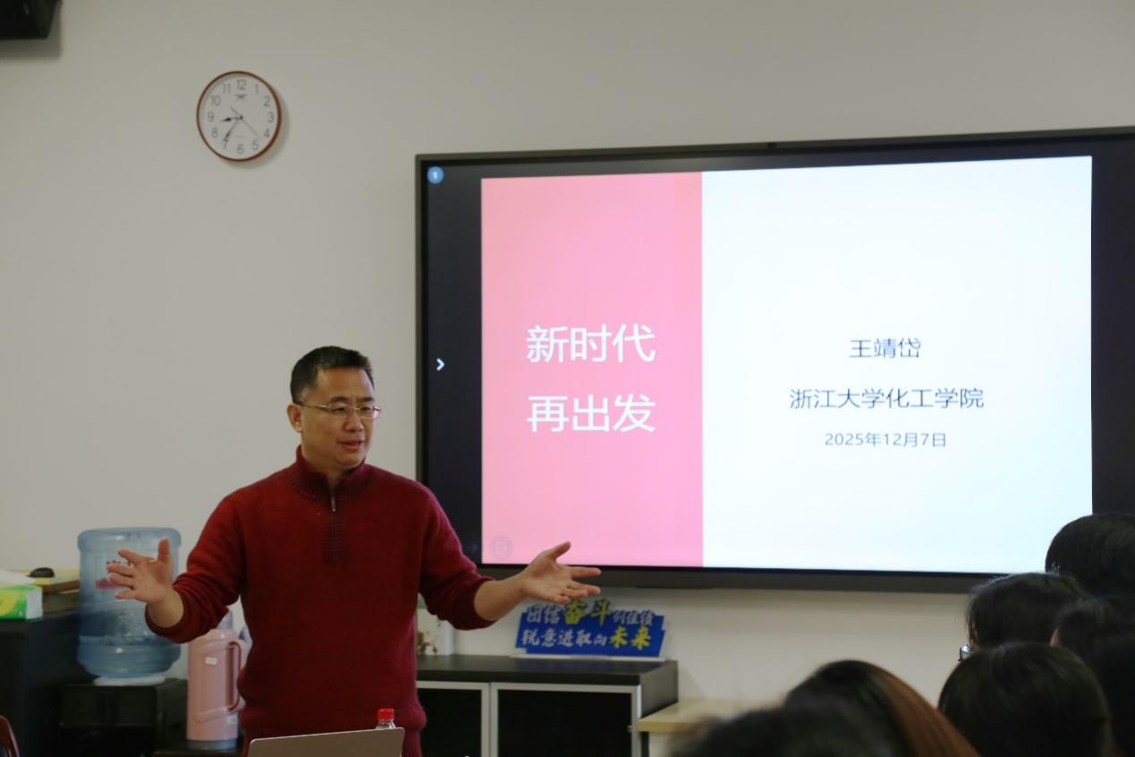 在全党上下深入学习贯彻党的二十届四中全会精神之际,12月7日上午,浙江大学化学系本科生第二党支部共“化”未来主题党日在紫金港校区海纳苑A319举行。浙江大学党委常委、副校长、化学工程与生物工程学院教授王靖岱作主题党课。化学系党委副书记张曼华、百人计划研究员董西昌、专职组织员李杨、专职辅导员商夏等列席。活动由本科生第二党支部书记钱璞凡主持。