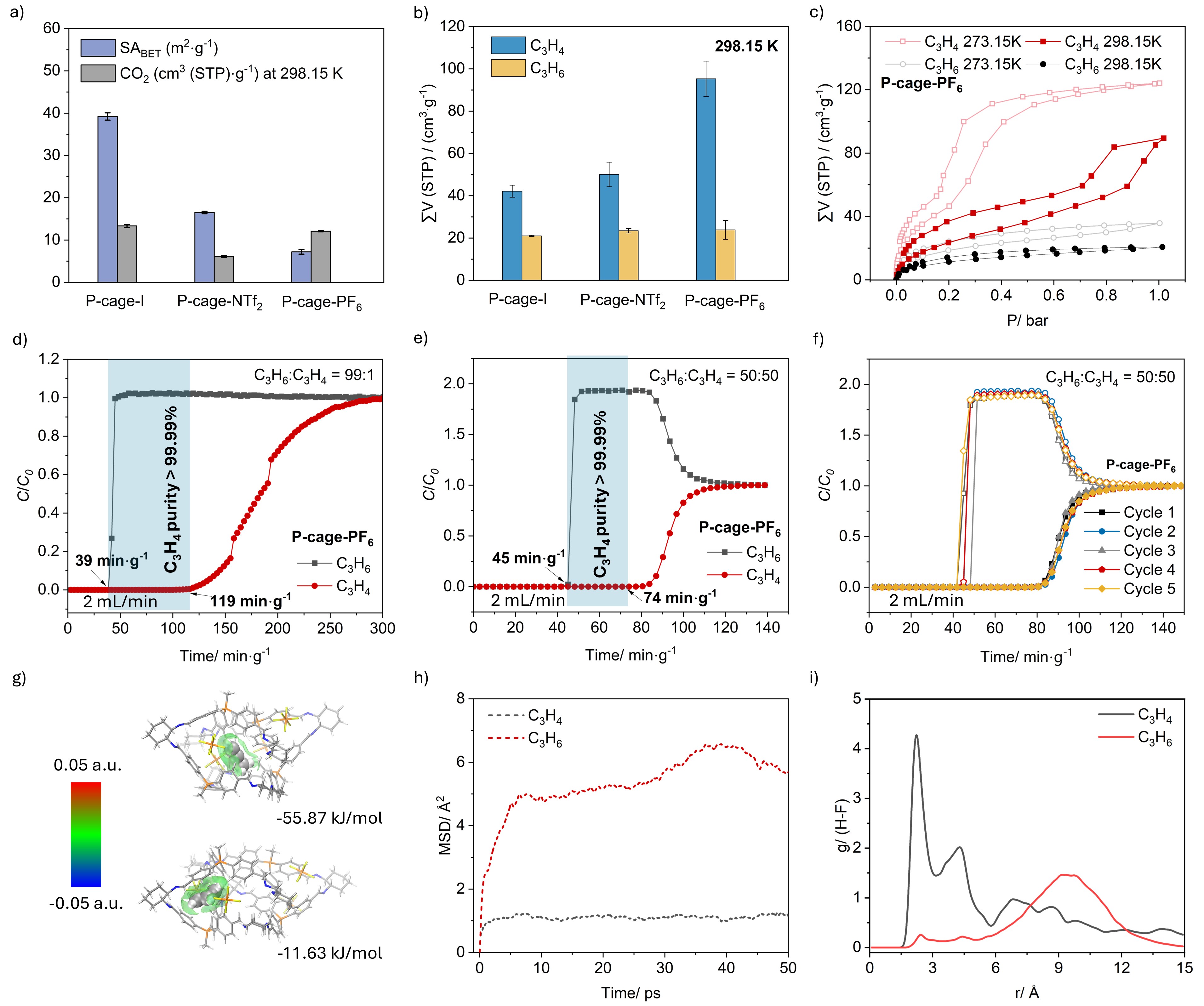 基于P-cage-NTf2与P-cage-PF6不同尺寸的窗口结构及丰富的反离子微环境,研究团队进一步评估了该系列季鏻离子笼对丙烯/丙炔的吸附分离性能。静态吸附结果显示,三种离子笼均对丙炔表现出很高亲和性,其中P-cage-PF6性能最优:在298.15 K和1 bar下丙炔吸附量达到89.4cm3/g,显著高于相同条件下丙烯的20.7cm3/g。同时,其丙炔吸附等温线呈现台阶式特征,表面吸附过程中存在开孔效应,与该拓扑中存在具有一定柔性的四边形窗口相吻合。模拟计算进一步揭示,丙炔的选择性吸附位点主要分布在反离子PF6-附近,可能源于弱酸性的丙炔与相对碱性的反离子之间的相互作用。穿透实验进一步证实了P-cage-PF6在实际分离条件下的优异表现及良好的可重复使用性。