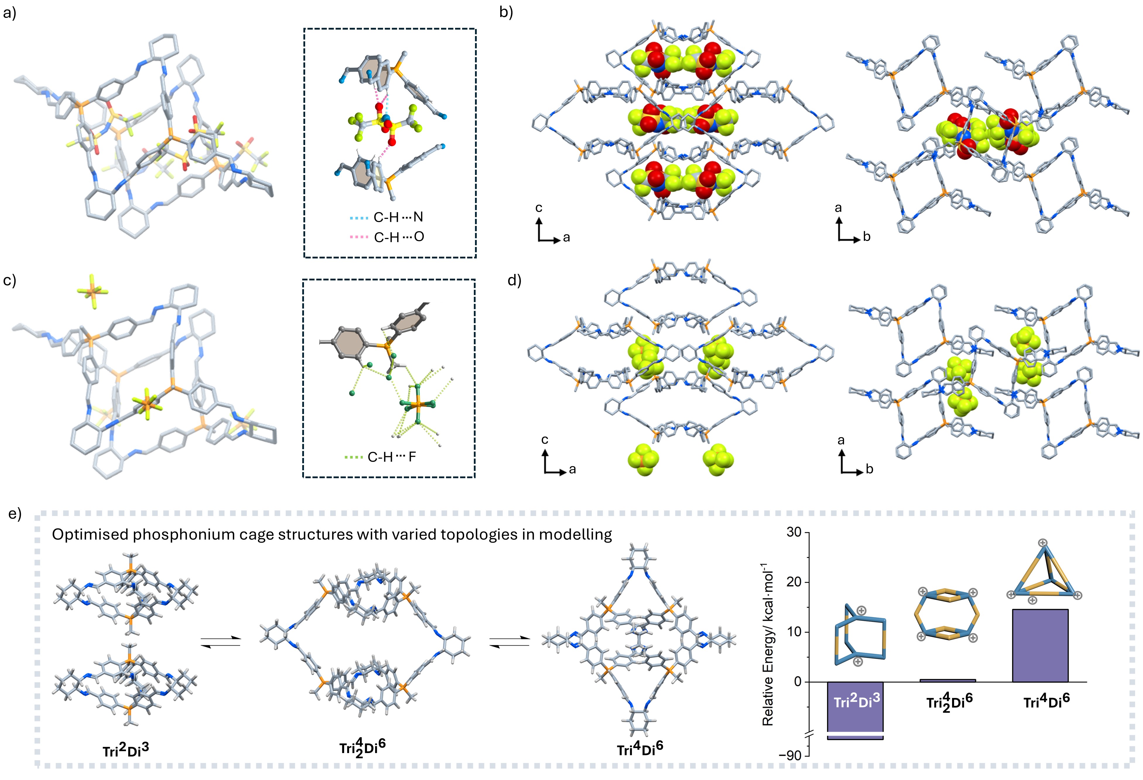 P-cage-NTf2与P-cage-PF6的核磁氢谱显示出明显的低对称性,偏离常见正四面体拓扑的 [4+6]组装模式。通过晶体培养与 单晶X射线衍射分析,研究团队确认了P-cage-NTf2与P-cage-PF6具有较低对称性的Di6拓扑结构。该拓扑(Di6)在已报道有机分子笼中非常罕见。对于其形成原因,团队推测季鏻化使三苯基膦取代基间夹角变大,构象自由度提升,为更大尺度组装提供了几何基础;而体积较大的反离子提供了阴离子模板作用;同时合成过程中产物的析出导致动态化学平衡被提前终止,使处于介稳状态的Di6结构得以分离获得。进一步地,Di6构型在溶液中可逐步转化为 [2+3]构型,说明[2+3]仍为热力学最稳定状态,与模拟结果相一致。